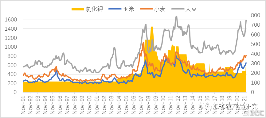 复盘历史,可以发现农产品的价格往往和氯化钾价格同频共振,钾肥产品中,氯化钾占主要市场份额,同时氯化钾的下游应用以农业为主。钾肥价格与农产品价格高度相关,一方面农产品价格高企会带动钾肥价格增长,另一方面钾肥的价格飙升也提高了农业生产的成本。