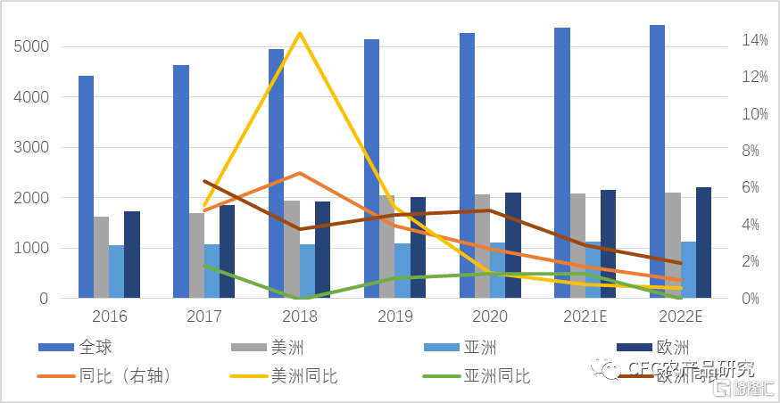 2018 年以来,全球钾肥产量增速自6.8%逐渐放缓。分区域来看,美洲的增速降幅最大,由2018 年14.4%降至2020 年1.4%。亚洲产量增速最小,2017-2020 年产量振幅保持在2%以内。FAO 预计2022 年欧洲将是钾肥产量增速最大的区域,预期能达到1.9%。