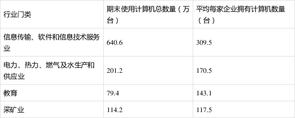 分行业看,平均每家企业使用计算机数排名前五的行业分别为信息传输、软件和信息技术服务业,电力、热力、燃气及水生产和供应业,教育,采矿业,科学研究和技术服务业,平均每家企业使用计算机数分别为309.5、170.5、143.1、117.5、117.3台。